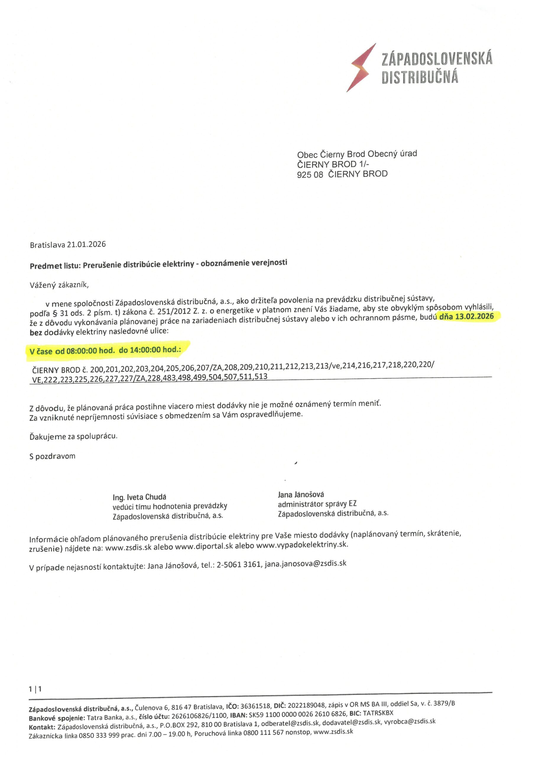 Oznamujeme Vám, že dňa 13.02.2026 v čase od 08:00 hod. do 14:00 hod. bude v určitých častiach našej obce plánované prerušenie distribúcie elektriny.